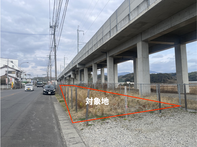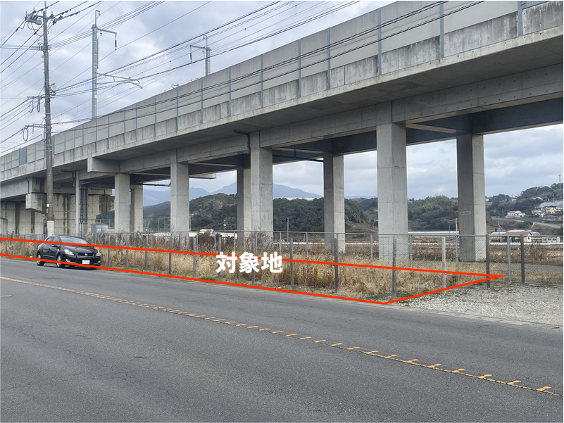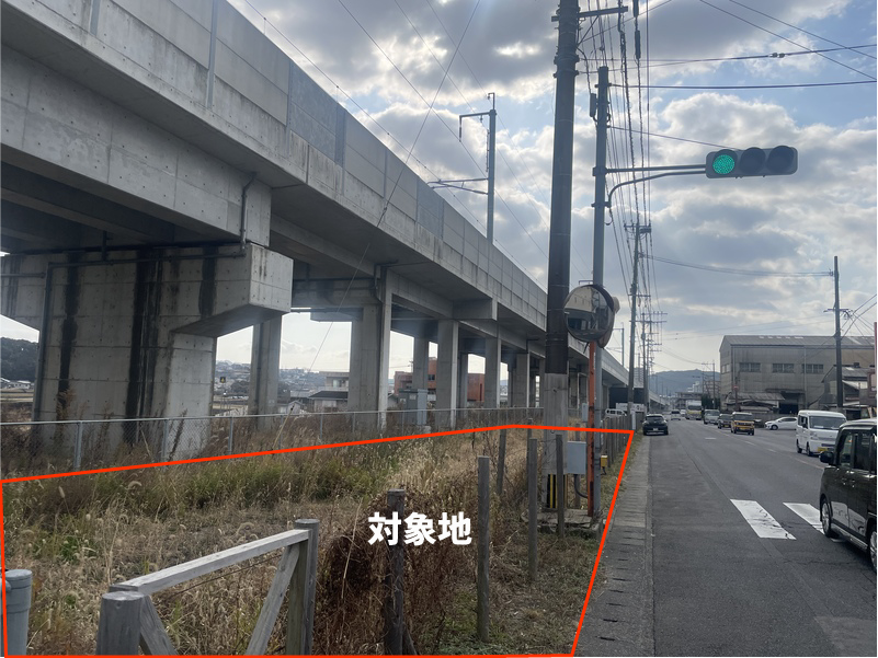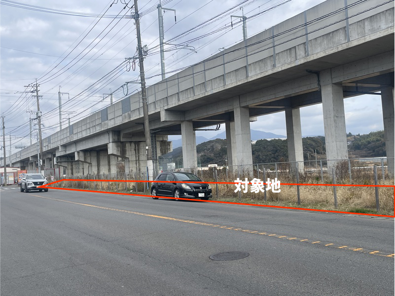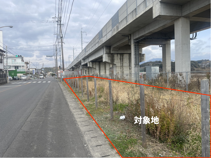 交通量の多いロードサイドに面した事業用地。間口約72mを活かし、店舗・事務所・車関連業や月極駐車場などに適しています。諫早駅徒歩13分、視認性の高い立地です。
